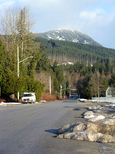 Looking up Park Road towards the start line, Gibsons & Area Community Centre on the right.